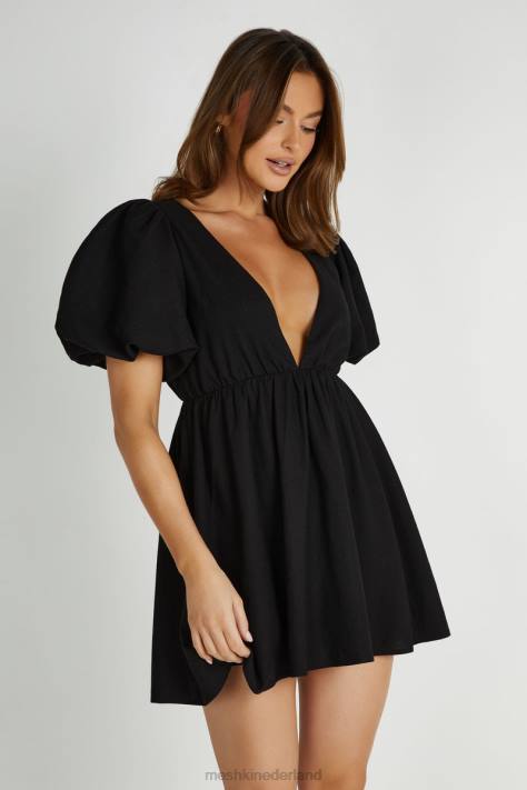 dit Is Een Midi-jurk Met Pofmouwen, Een Diepe, Open Rug En Een Uitlopende A-lijn Rok. De Rok Is Losjes Geplooid Met Een Nette Zoom Die Tot Halverwege De Dij Valt. De Mouwen Zijn Kort En Gepoft En Aan De Uiteinden Iets Gesloten Om Een vollere, Meer Ronde Vorm Te Creëren. Een Hoge, Zelfbindende Sluiting Aan De Achterkant Contrasteert Met De Diepe V-hals Aan De Achterkant. De Halslijn Aan De Voorkant Is Ook Een V-hals Met Een Vergelijkbare Diepte Om Een vleugje Decolleté Te Laten Zien. Licht, Luchtig En Gemaakt Van Zacht Linnen, Myrah Zweeft Praktisch Om Je Heen.