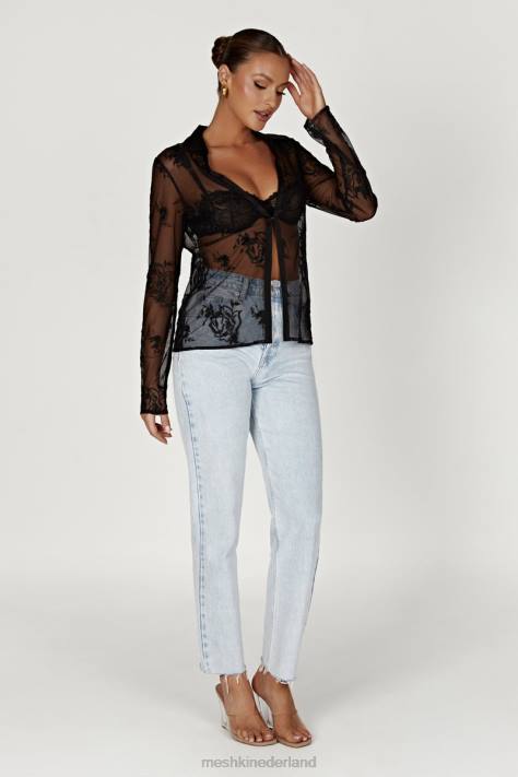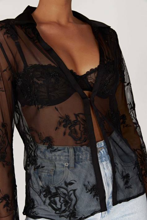 dit Is Een Geborduurd Mesh-overhemd Met Kralen, Een Satijnen Sluiting En Een Halslijn Met Kraag. Dit Overhemd Is Gemaakt Met Haak- En Oogsluitingen Middenvoor En Biedt Een Soepele Pasvorm Over De Buste, Terwijl De Doorzichtige Stof Met Lange Mouwen De Aandacht Trekt, Zelfs Als Deze Bedekt Is. Combineer Met Onze Vivica Geborduurde Mesh Minirok Of Meshki Denim Om De Look Compleet Te Maken.